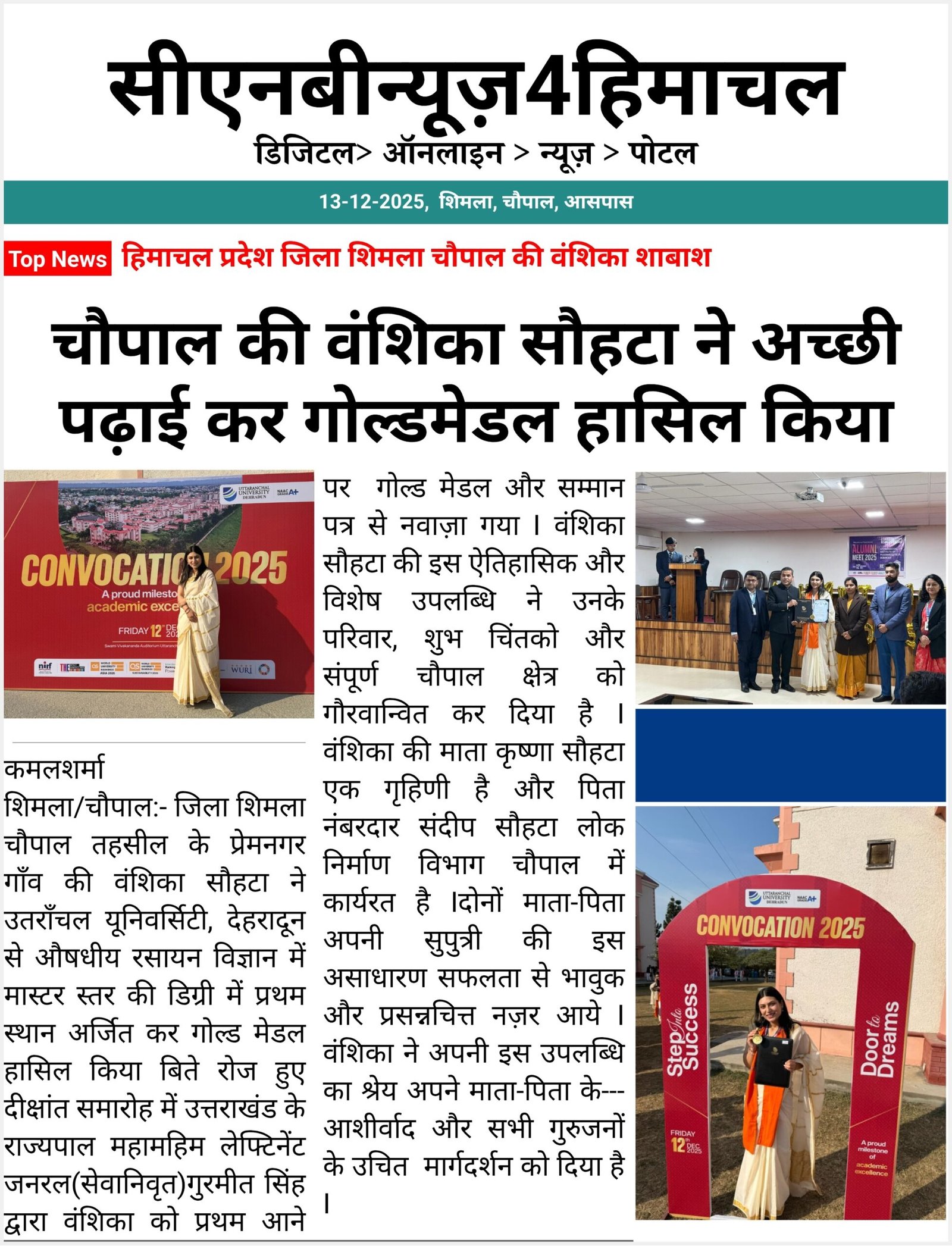 चौपाल की वंशिका सौहटा ने अछि पढ़ाई कर गोल्डमेडल हासिल किया