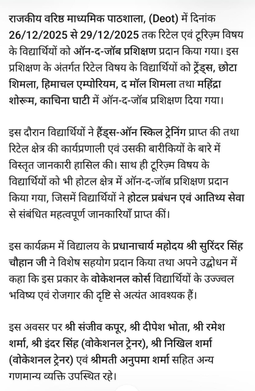 चौपाल उपमंडल सीनियर सेकेंडरी स्कूल देवत में रिटेल व टूरिज्म विषय के विद्यार्थियों को ऑन द-जॉब प्रशिक्षण किया गया प्रदान 3 days ago 59 Views